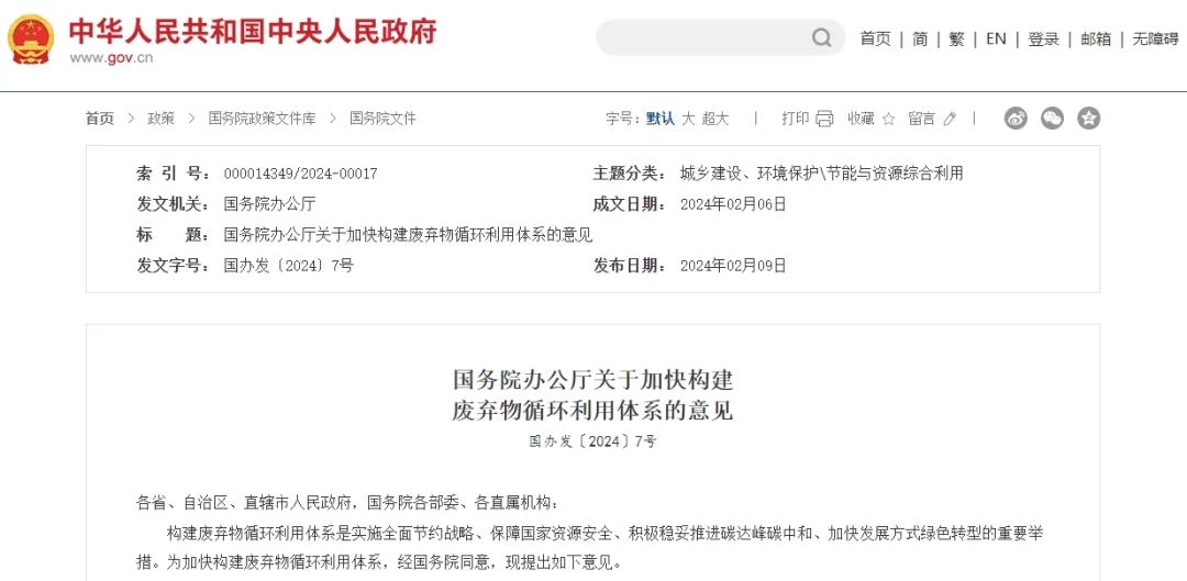 事實上,政府工作報告并不是唯一的信號。早在今年2月9日,國務院辦公廳印發(fā)《關于加快構(gòu)建廢棄物循環(huán)利用體系的意見》(下稱《意見》),就透露出一些與眾不同的信號。